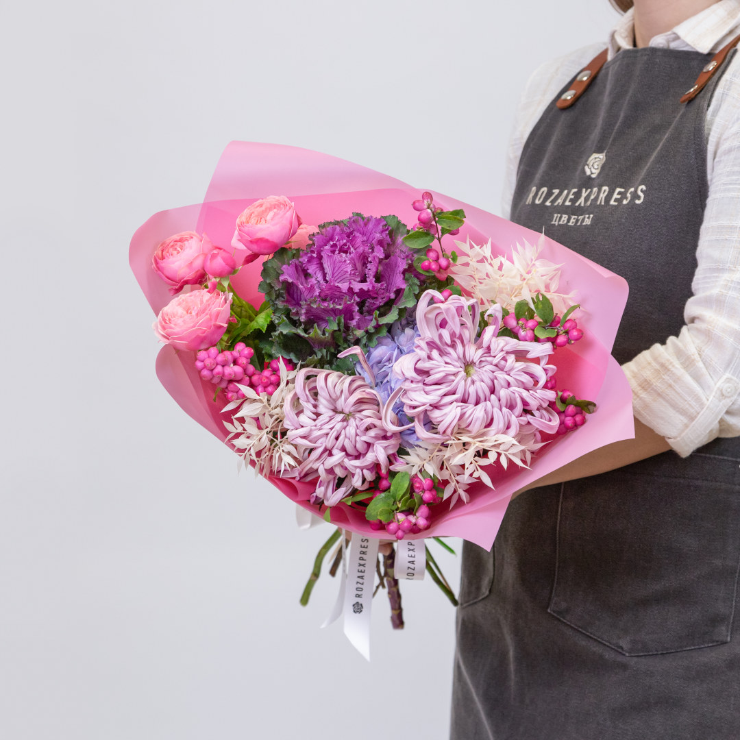 Брассика сиреневая 1 шт, гортензия сиреневая 1 шт, роза Сильва Пинк кустовая 1 шт, рускус белый 1.5 шт, снежноягодник розовый 1 шт, хризантема Виена пинк 2 шт.