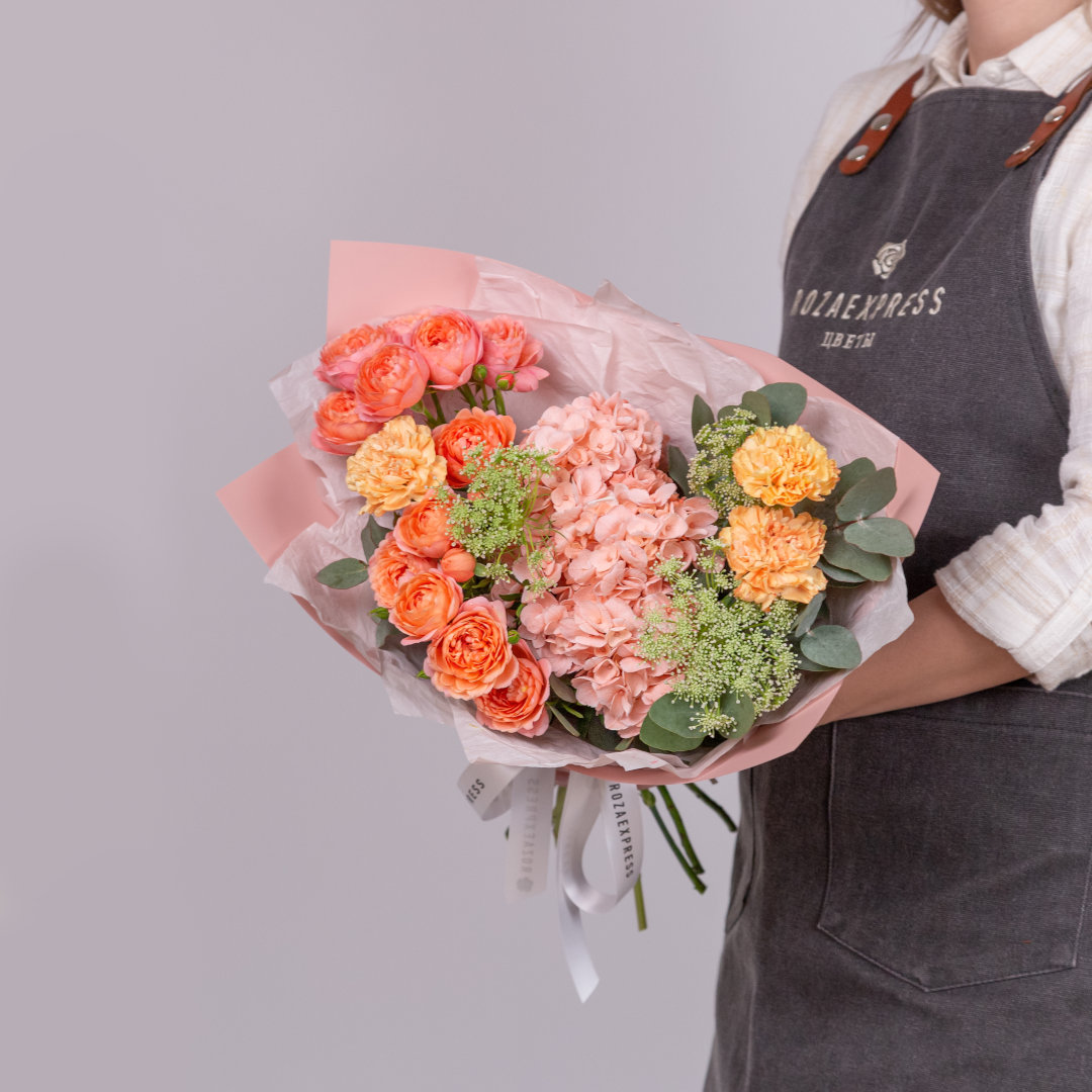 Амми 3 шт, гвоздика жёлтая 3 шт, гортензия персиковая 1 шт, роза Джульетта кустовая 2 шт, эвкалипт.