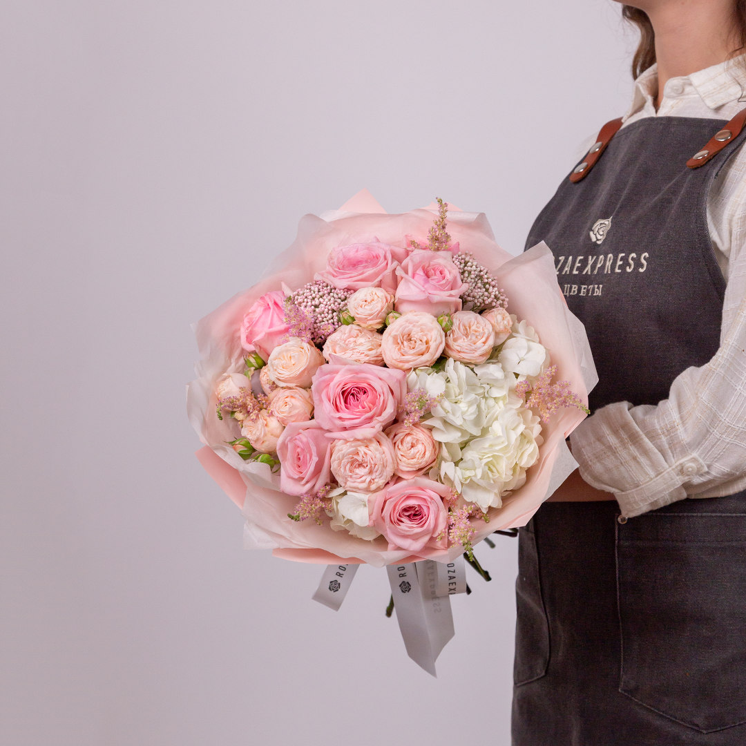 Астильба розовая 7шт, гортензия белая 1 шт, озотамнус розовый 2 шт, роза Бомбастик кустовая 4 шт, роза Пинк Охара 7 шт, писташ.