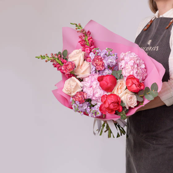 Амариллис фуксия 1 шт, гвоздика розовая 2 шт, гортензия розовая 1 шт,