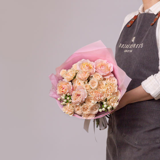 Гвоздика Лиззи 3 шт, гортензия белая 1 шт, илекс оранжевый 1 шт, роза Вайт Охара 6 шт, рускус снежн…