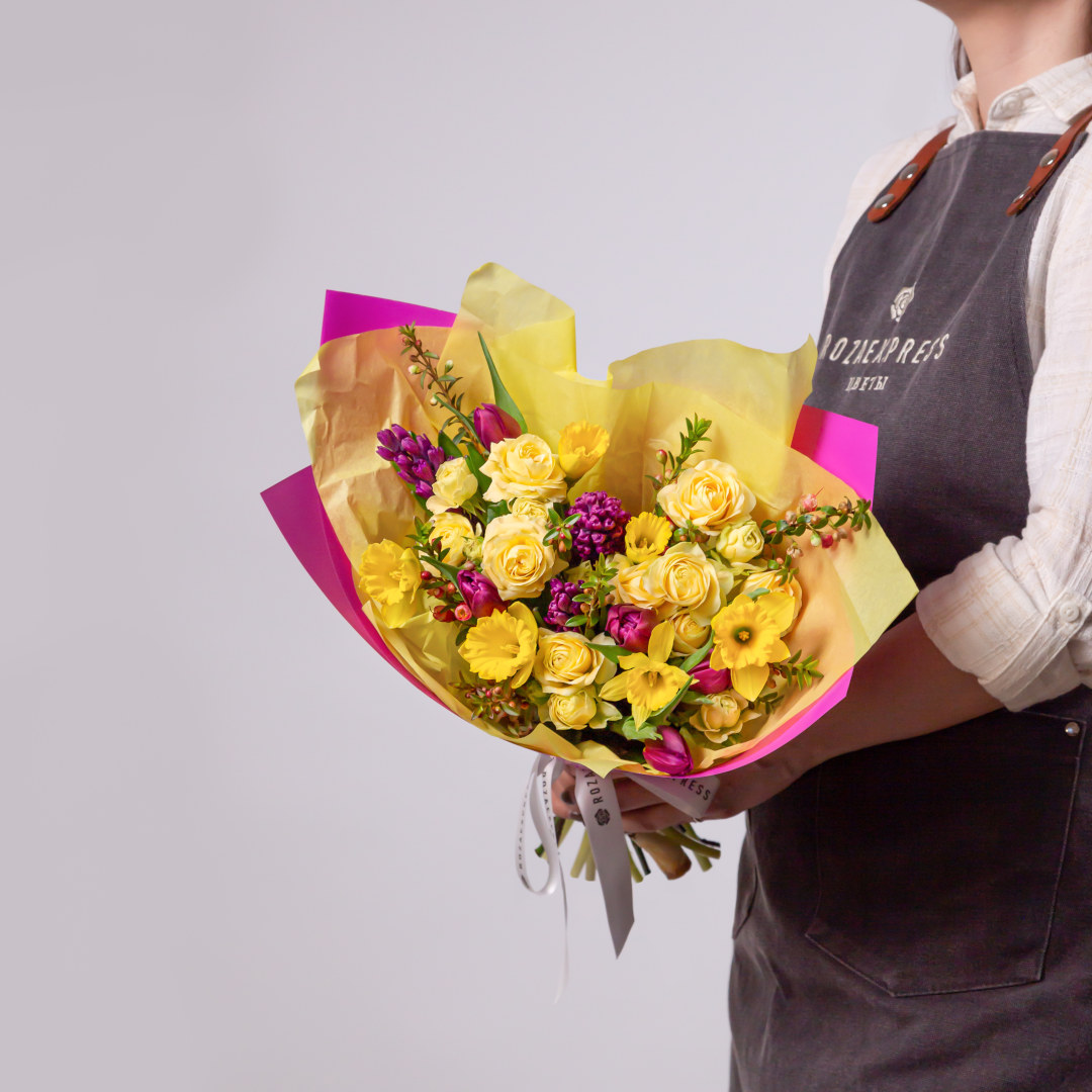 Кустовые розы Джульетта и тюльпаны Пэррот