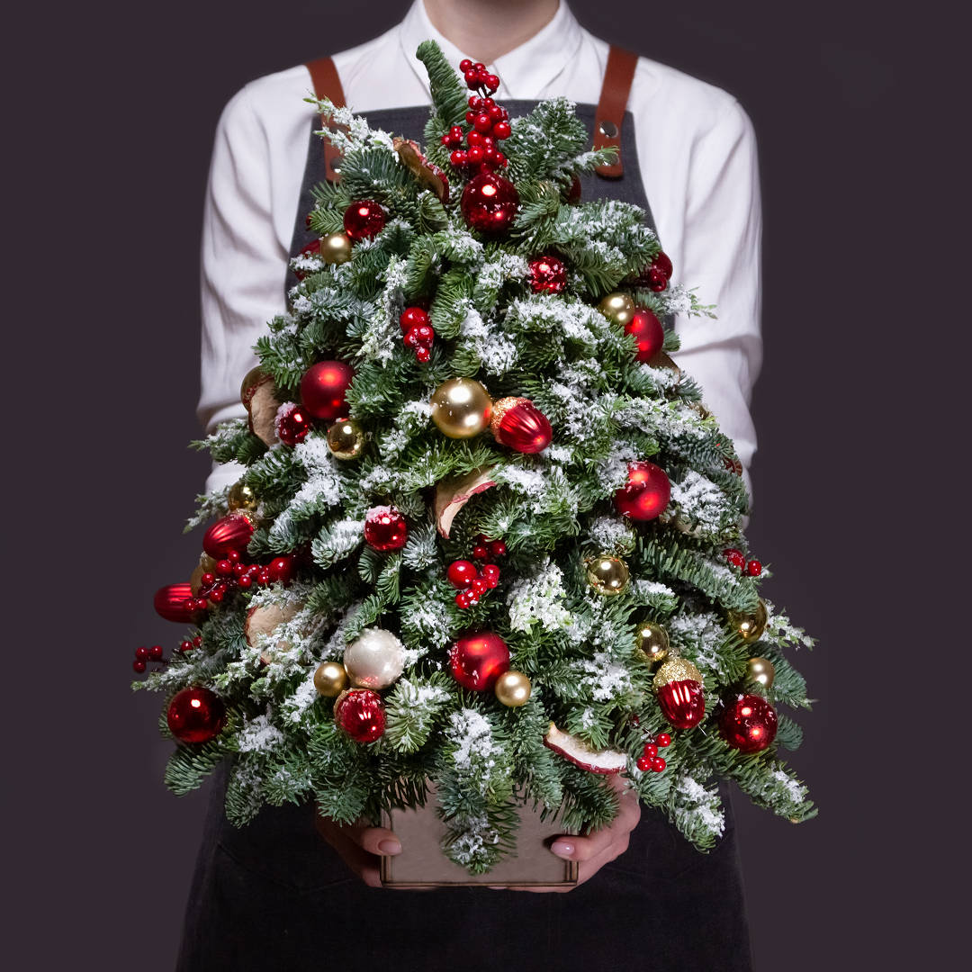 Новогодняя композиция из живой голландской пихты. В составе: натуральная пихта, яблочные дольки,стеклянные шары, веточки, жёлуди, фигурные стеклянные шары, сушеные дольки апельсина.