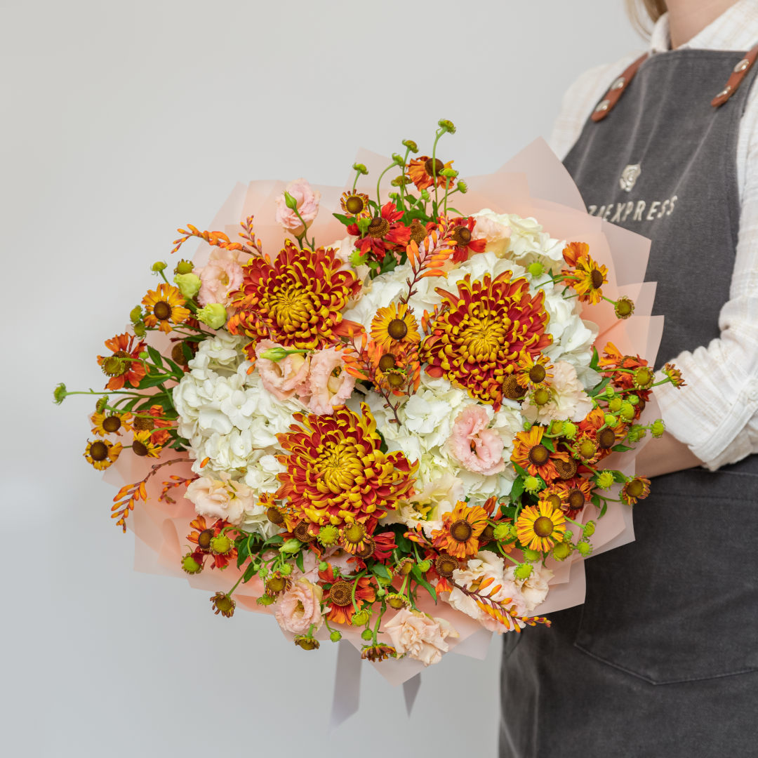Гелениум 7 шт, гортензия белая 3 шт, крокосмия 5 шт, хризантема бежевая 3 шт, эустома априкот 3 шт, писташ.