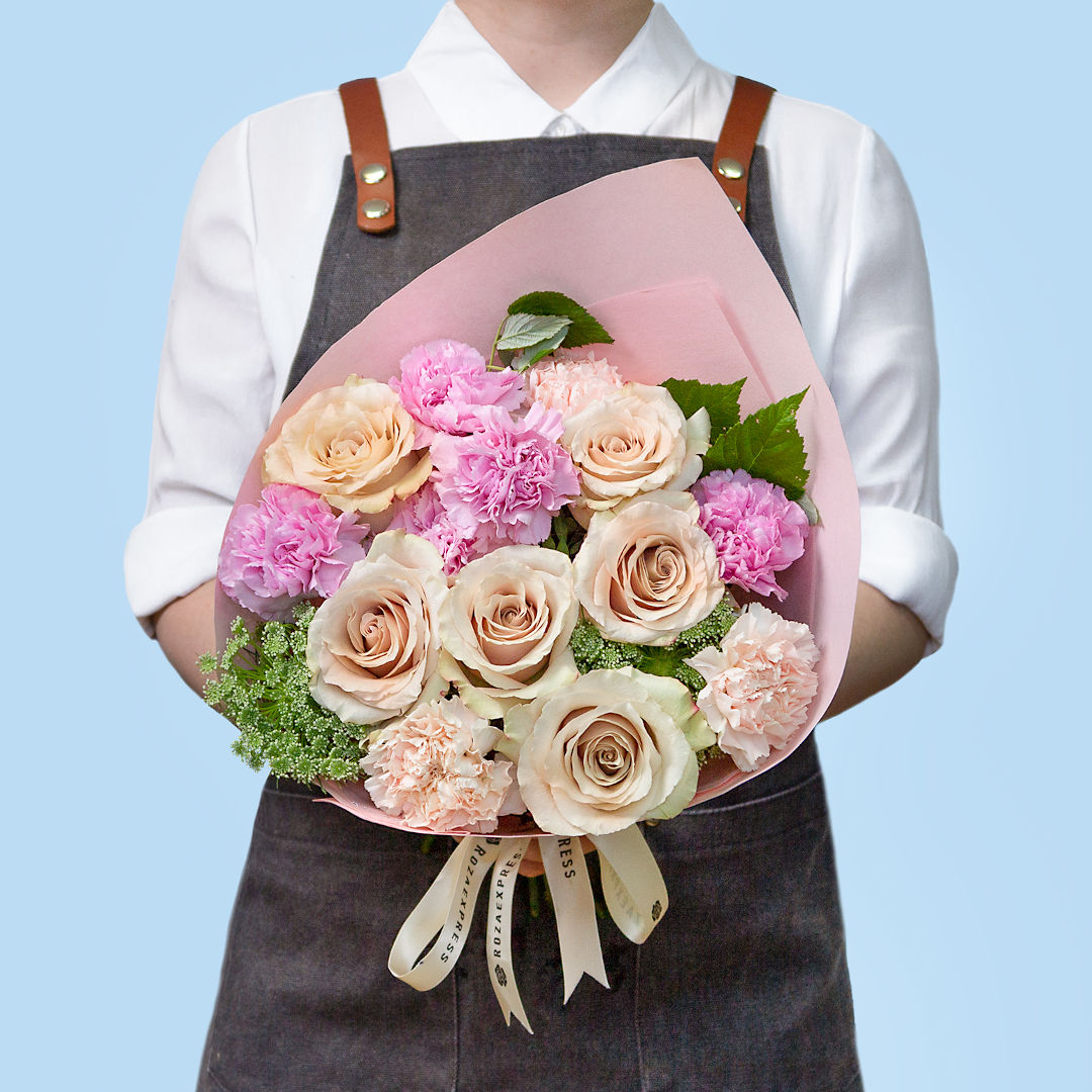 роза Квиксенд 5 шт, гвоздика розовая 3 шт, амми 3 шт, роза Бомбастик кустовая 1 шт, писташ.