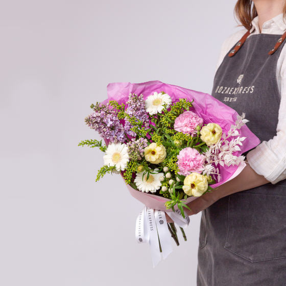 Ранункулюс Ханой 5 шт, роза Мисти Баблз 3 шт, тюльпан сиреневый 9 шт, гвоздика розовая 8 шт, гвозди…