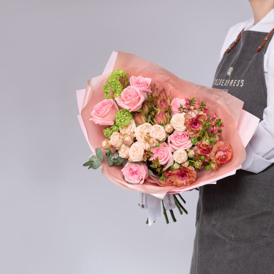 Ранункулюс Ханой 6шт, гвоздика Лиззи 6шт, гвоздика розовая 4шт, роза Свит Сара кустовая 7шт, гипери…