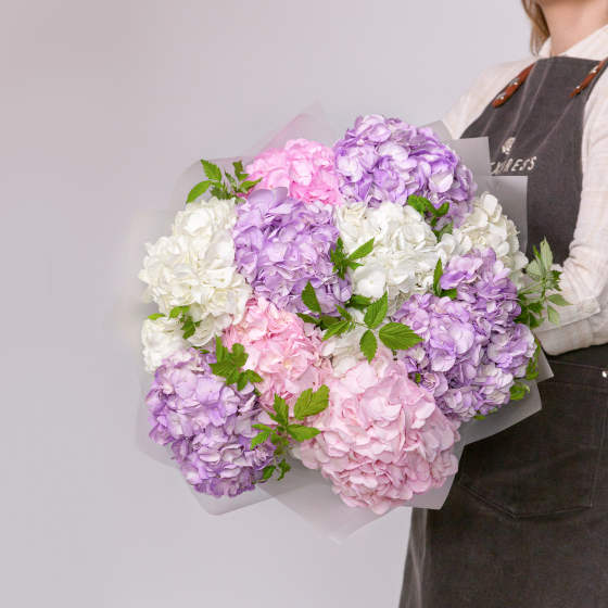 Гортензия сиреневая 3 шт, ранункулюс кремовый 7 шт, эвкалипт, кониферн.