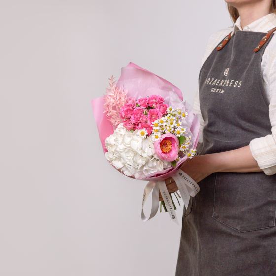 Гвоздика розовая 2 шт, гортензия белая 1 шт, ранункулюс розовый 3 шт, рускус снежный белый 1 шт, ш…