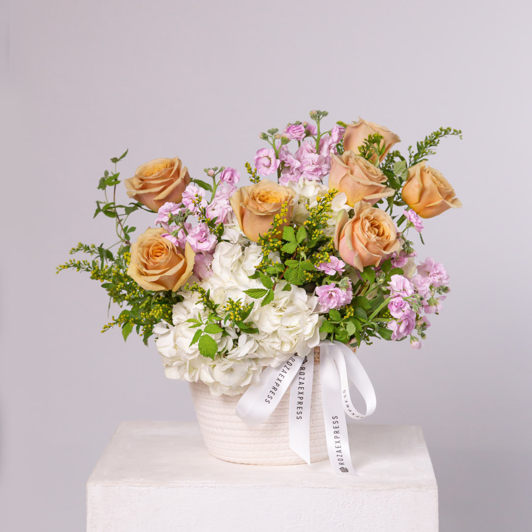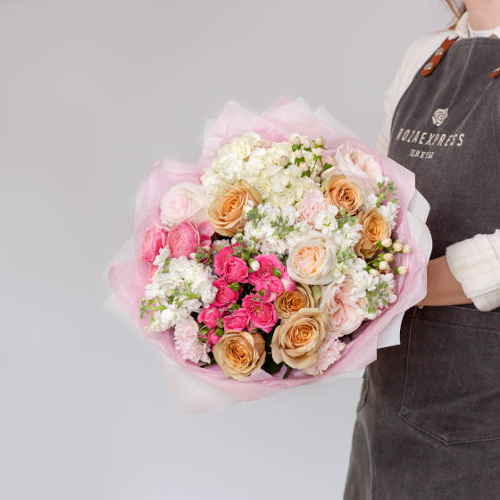 Гортензия персиковая 2 шт, розы Тофи 7 шт, роза Бомбастик кустовая 1 шт, эвкалипт стабилизированный…