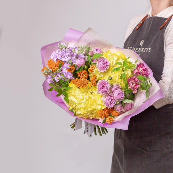 Гортензия сиреневая 1 шт, кониферн персиковый 2 шт, роза Мисти Баблз 1 шт, тюльпан оранжевый 7 шт.