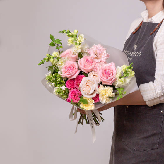 В своих работах мы используем только свежие цветы, среди которых много экзотических цветов и необычных сортов роз. Каждый букет доставляется в аквапаке, что позволяет сохранять свежесть букета при транспортировке.