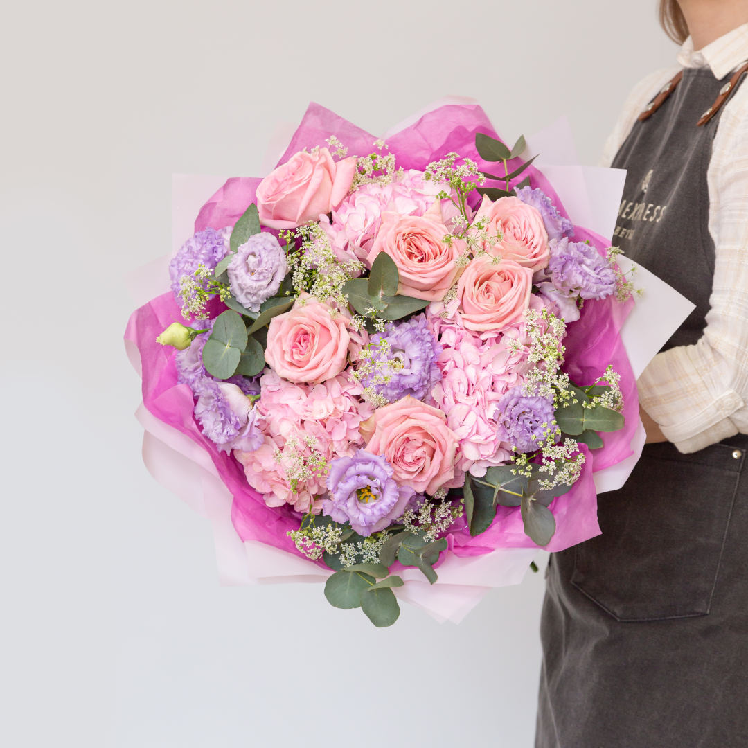 Гортензия белая 1 шт, роза Лавендер Букет 3 шт, тюльпан Колумбус 3 шт, гвоздика Лиззи 3 шт, эвкалип…