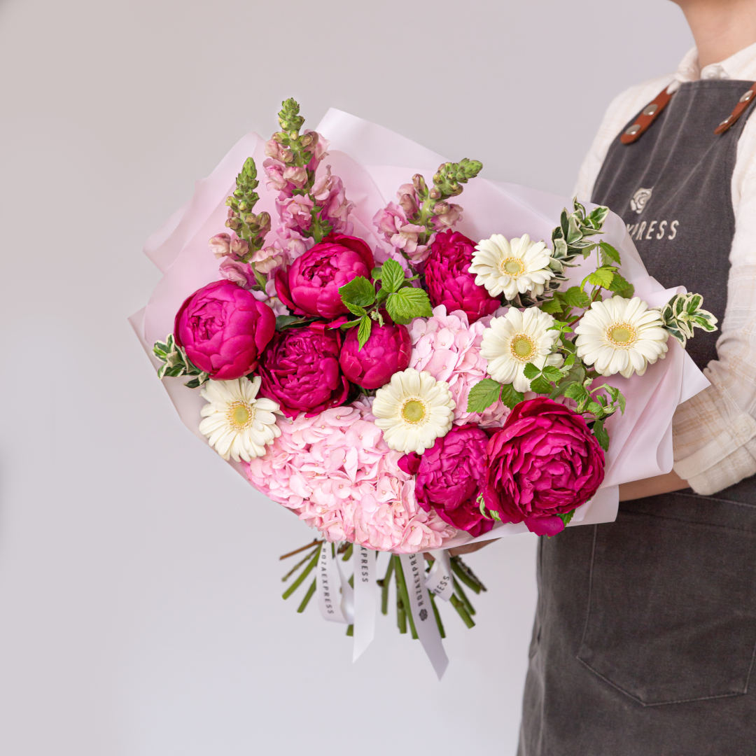 Гвоздика розовая 3 шт, гортензия розовая 2 шт, ранункулюс розовый 2 шт, роза Бомбастик кустовая 2 ш…