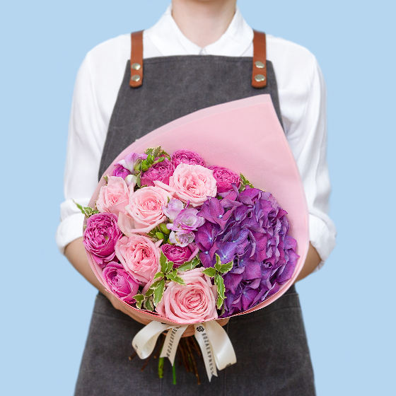 Гортензия белая 2 шт, гортензия персик 1 шт, роза Лавендер Букет 5 шт, гвоздика черничная 5 шт, иле…