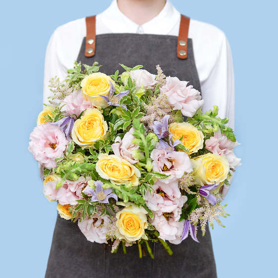 Амми 2 шт, гвоздика Лиззи 3 шт, гортензия сиреневая 1 шт, роза Вайт Охара 1 шт, роза Джульетта куст…