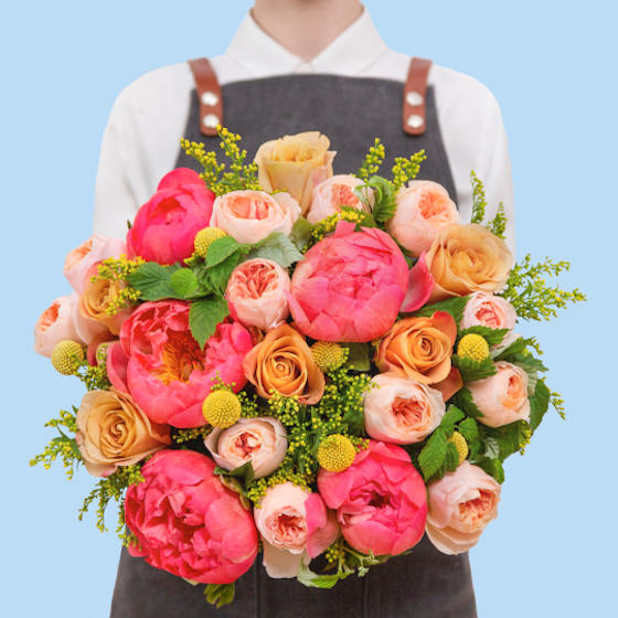 Гортензия синяя 1 шт, пион Корал Шарм 3 шт, солидаго 4 шт, гиперикум розовый 1 шт, роза Бандолеро к…