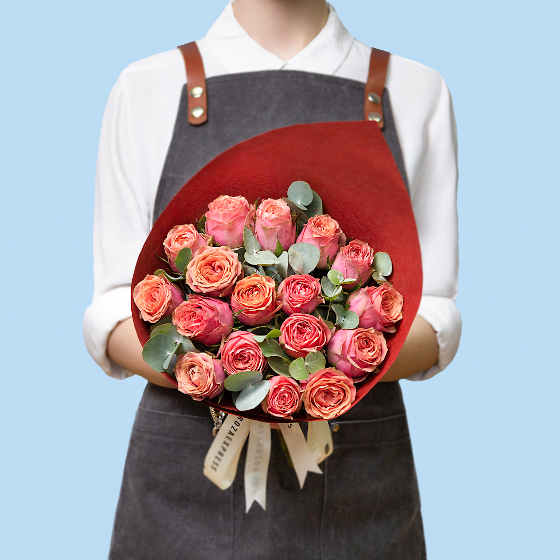 Роза красная кустовая 5 шт, эвкалипт, писташ.