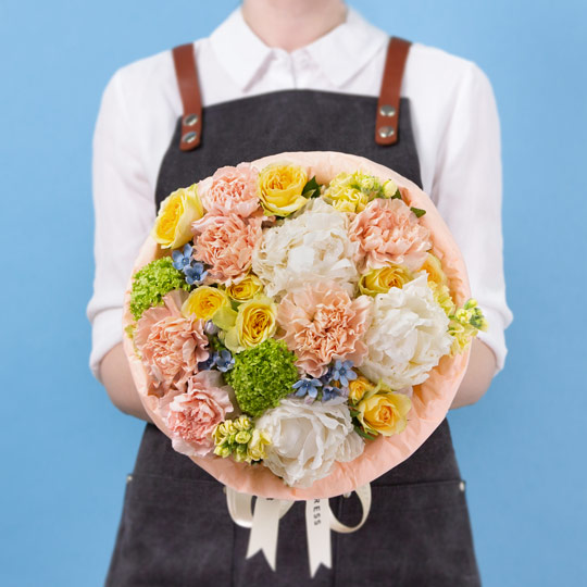 Амми 3 шт, гвоздика жёлтая 3 шт, гортензия персиковая 1 шт, роза Джульетта кустовая 2 шт, эвкалипт.
