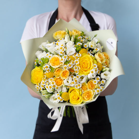 Гвоздика Лиззи 3 шт, гортензия желтая 1 шт, лагурус желтый 1 шт, листья магнолии, роза Джульетта ку…